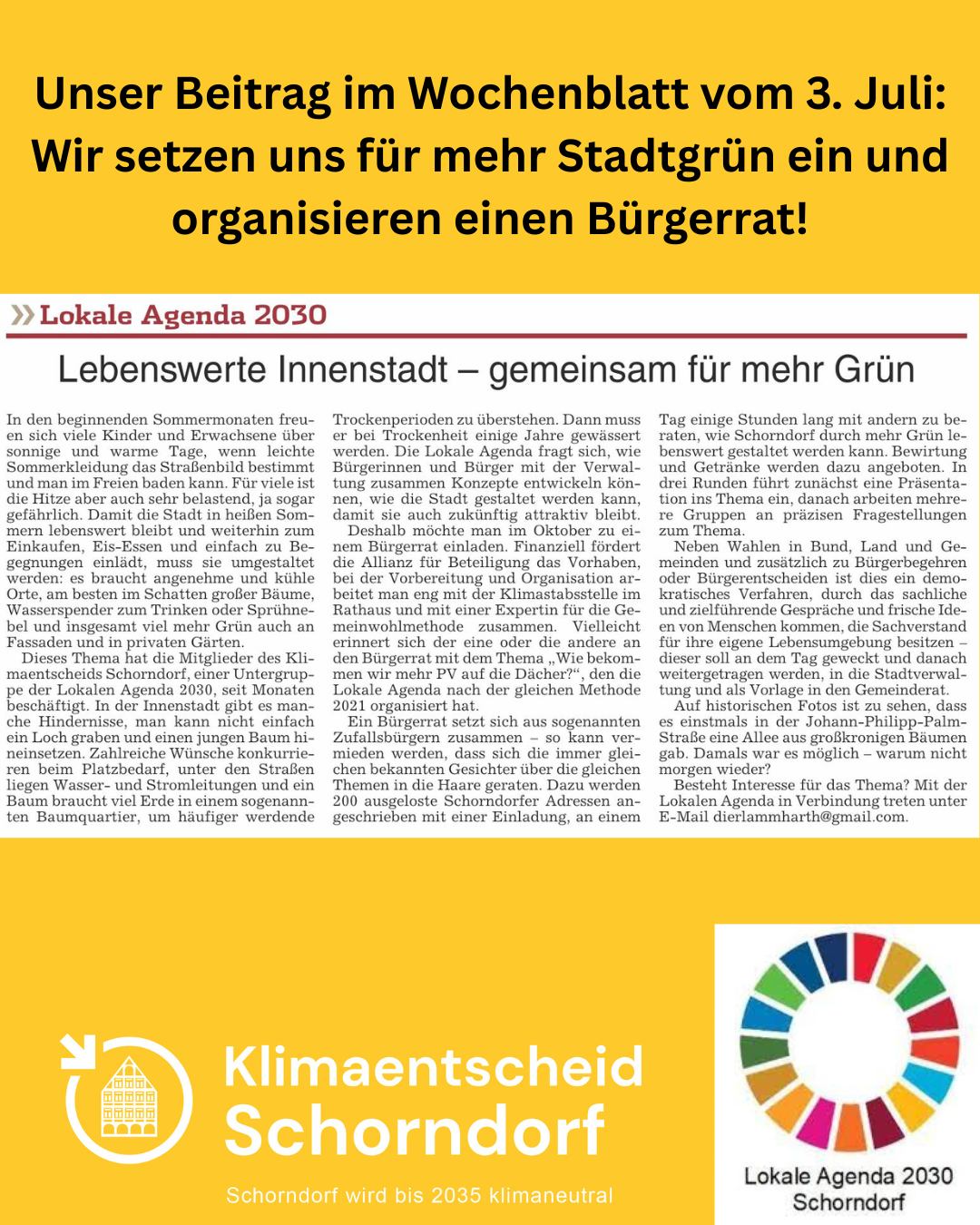 ![]() | Unser Beitrag im Wochenblatt vom 3. Juli 2025. Wir setzen uns für mehr Stadtgrün ein und organisieren einen Bürgerrat! Der Beitrag lässt sich im Schorndorf Aktuell vom 03. Juli online oder auf Papier lesen oder bald auf unserer Website unter „Presse“. |